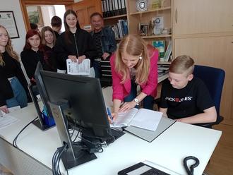 Im Bürgermeisterdienstzimmer durften die Schüler zur Unterzeichnung der gefassten Beschlüsse Platz nehmen
