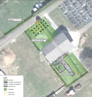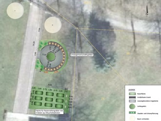 Die Urnengemeinschaftsanlage in Kranlucken wird durch eine im Bild ersichtliche abgerundete Form am Eingang des Friedhofes (Weinhauck) entstehen – in unmittelbarer Nähe dazu die Wiesengräber mit drei Stelen aus Muschelkalk, auf denen die personalisierten Bronzeplatten mit den Namen der Verstorbenen aufgebracht werden.