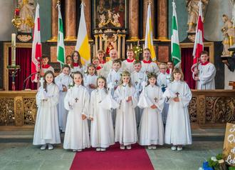 Die 15 Erstkommunionkinder aus Geisa zusammen mit Pfarrer Martin Lerg und den Messdienern