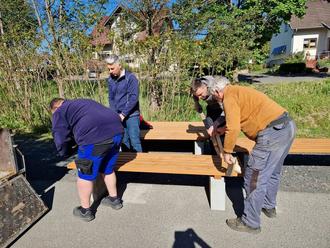Die Helfer beim Aufbau der Sitzbänke