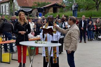Pfarrer Aloysius Ndiukwu (Mitte) segnete die Brücke ein (links Ortsteilbürgermeister Hubert Wilhelm, rechts Bürgermeisterin Manuela Henkel)