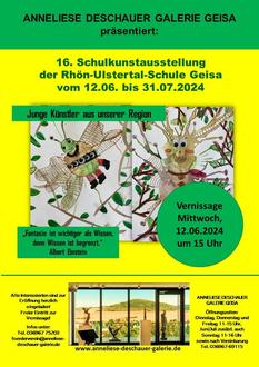 Geisa. Zum 16. Mal stellen junge Künstler der Rhön-Ulstertal-Schule Geisa ihre Werke öffentlich aus. Erstmals wird der Ausstellungsort in den Räumen der ANNELIESE DESCHAUER G a l e r i e sein. Die öffentliche Vernissage zur Ausstellung findet am Mittwoch, 12. Juni 2024, um 15 Uhr statt. Alle Interessierten sind dazu herzlich eingeladen.