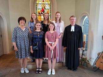 Die fünf Konfirmandinnen Mia Röll, Marleen Schümann, Sarah Dumack, Marie Körber und Johanna Kling mit Pfarrer Jourdan und Gemeindepädagogin Doris Gerhardt