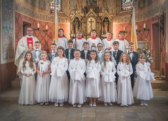 Pastor Dr. Jürgen Kämpf mit den Kommunionskindern aus Geismar, Spahl, Ketten und Wiesenfeld.