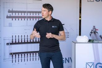 Sandro Neumann, Geschäftsführer der GNV GmbH, stellt das Unternehmen und seine innovativen Produkte den Gästen vor.