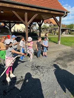 Ein besonderes Highlight war die Löschübung mit Kübelspritze und einem Modell-"Feuerhaus", bei dem die Kinder ihr frisch erworbenes Wissen gleich anwenden konnten. Auch die Lehrkräfte ließen es sich nicht nehmen, selbst Hand an Strahlrohr und Kübelspritze zu legen – zur großen Freude der kleinen Zuschauerinnen und Zuschauer.