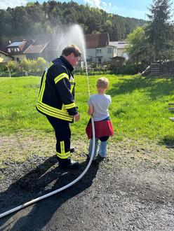 Feuerwehrkamerad Johannes Fischer zeigt einem Grundschüler mit viel Geduld und Expertise den Umgang mit dem Strahlrohr