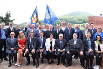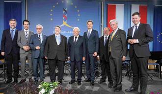 Gruppenfoto zum Abschluss einer festlichen Veranstaltung (von links): Prof. Paro Pavo Barišić (Generalsekretär Paneuropa-Union Straßburg), Christian Hoferer (Vorsitzender der Paneuropa-Jugend), Johannes Kija (Bundesgeschäftsführer Paneuropa-Union Deutschland, München), Dr. Bernd Posselt (Präsident Paneuropa-Union Deutschland), Alain Terrenoire (Präsident der Internationalen Paneuropa-Union), Christian Hirte (Präsident Kuratorium Deutsche Einheit), Prof. Dr. Philippe Nuss (Paneuropa-Union Frankreich), Dr. Jürgen Aretz (Vizepräsident Kuratorium Deutsche Einheit) und Dr. Stefan Heck (Stiftungsratsvorsitzender Point Alpha Stiftung)