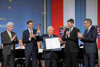 Prof. Dr. Norbert Kleinheyer, Dr. Stefan Heck, Christian Hirte und Dr. Jürgen Aretz (von rechts) gratulieren der Internationalen Paneuropa-Union zur Auszeichnung und überreichen dem Präsidenten Alain Terrenoire (Mitte) Trophäe und Urkunde