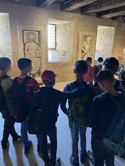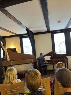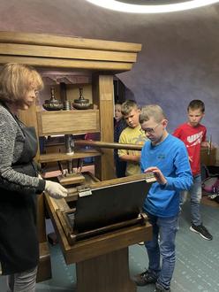 Die Klassen 3 begaben sich in einen schummerig beleuchteten Keller zum Workshop “Tintenfleck und Federkiel“. Hier waren rundherum Vitrinen mit vielen Informationen zur Zeit Luthers ausgestellt. Jeder Schüler erhielt eine Schreibunterlage mit Forscherfragen, die sie nun an den einzelnen Stationen lösen konnten. Zwischendurch hatte jeder die Gelegenheit an einer richtigen Druckerpresse mit viel Kraft einen wunderschönen Druck von der Wartburg herzustellen. Diesen durften die Kinder als Erinnerung mit nach Hause nehmen. Im Workshop „Sag mal, Eli“ beschäftigte sich die 4. Klasse anhand von Bildern und Gegenständen aus der Geschichte detaillierter mit dem Leben und Wirken der heiligen Elisabeth. Dabei setzten sie sich intensiv mit einem selbstgewählten Gemälde auf verschiedenste Weise auseinander. Die Klassen 3 und 4 wanderten anschließend in das Bachhaus. Dort erlebten sie eine interessante und mitreißende Führung. Altertümliche Instrumente wurden vorgestellt sowie Musikstücke auf diesen vorgespielt. Hier durften einige Schüler sich im Trompetespielen testen oder dafür Sorgen, dass die Orgel genug Luft hat, um auf ihr spielen zu können. Viele interessante Informationen aus dem Leben Johann Sebastian Bachs erfuhren die Schülerinnen und Schüler beim Rundgang durch diese Gedenkstätte und konnten so ihre Forschungsaufträge erfüllen. Im neuen Teil des Bachhauses gab es viele Möglichkeiten sich mit klassischer Musik auseinanderzusetzen. „Uns ist es wichtig, den Schülerinnen und Schülern Gedenkstätten ihres Heimatkreises und die damit verbundenen historische Ereignisse in einer einprägenden und anschaulichen Art und Weise zu vermitteln. „Die Kinder nehmen die Möglichkeit des Lernens am anderen Ort gerne an und haben Freude am aktiven Lernen.“ fasste Schulleiterin Kathrin Rübsam zusammen.