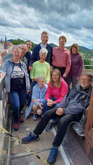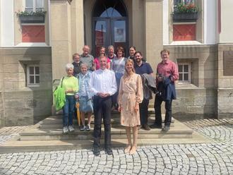 Geisa. Gemeinsam mit aktuellen und ehemaligen Arbeitskollegen aus dem Bistum Fulda und dem Bistum Freiburg besuchte Fuldas Bischof Dr. Michael Gerber Mitte Juni das Geisaer Land. Nach einer Besichtigung der Mahn- und Gedenkstätte Point Alpha hatte Geisas Bürgermeisterin Manuela Henkel zu einem Austausch in das Rathaus eingeladen. Das schöne Wetter nutzte die Gruppe im Anschluss um gemeinsam mit Gästeführerin Astrid Weimann-Heim das Glockenspiel der katholischen Kirche „St. Philippus und Jakobus" zu besichtigen. Dort gab es von Astrid Weimann-Heim auch Wissenswertes zur Geschichte der Kirche und deren sakralen Gegenständen. Belohnt wurde der steile Treppenaufstieg zum Kirchturm dann mit einem herrlichen Blick auf die historische Altstadt von Geisa und in die Rhön.