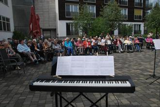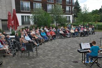 Von dem über eineinhalbstündigen Live-Konzert waren die zahlreichen Altenheimbewohner begeistert. Sie hatten im Freien im Innenhof der Einrichtung auch zum Teil mit ihren Rollatoren Platz genommen. Sie verfolgten von hier aus das interessante und abwechslungsreiche Konzert. Die Moderation der Veranstaltung übernahmen gekonnt Musiklehrerinnen Beate Bach und Kathrin Gärtner.