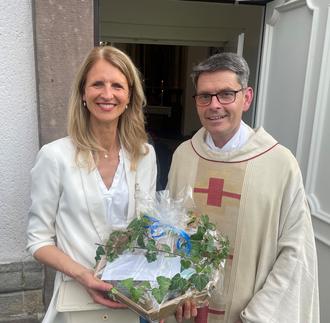 Bürgermeisterin Manuela Henkel überreichte Pfarrer Markus Blümel zum Abschied ein Präsent