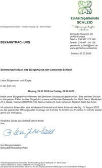 bleibt unser Bürgerbüro im Rahmen der jährlichen Urlaubszeit geschlossen. Bitte wenden Sie sich in dringenden Fällen an das Bürgerbüro unserer erfüllenden Gemeinde der Stadt Geisa, Marktplatz 27 in Geisa, Telefon 036967/69-100. Gerne melde ich mich mit einem Rückruf direkt bei Ihnen.