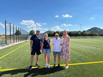 Christian Simon, Emma Simon, Martin Bernhard und Manuela Henkel an der Sportanlage Geisa.