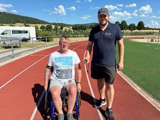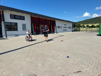 Thorsten Steinhauer und Christian Simon nach der nächsten erfolgreich abgeschlossenen Disziplin – 50 Meter Rollstuhl fahren mit zeitlicher Vorgabe.