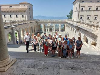 Am Mittwoch ging es mit dem Bus raus aus der Stadt zum in den Bergen zwischen Rom und Neapel gelegenen Monte Cassino. Die Abtei Montecassino ist das vom Hl. Benedikt von Nursia gestiftete Mutterkloster der Benediktinermönche und gilt als einer der bedeutendsten geistlichen Zentren des Mittelalters, welches jedoch im zweiten Weltkrieg aufgrund schwerer Bombardements bis auf die Grundmauern zerstört wurde. In den Folgejahren des Krieges konnte das Kloster jedoch fast vollständig und originalgetreu wiedererrichtet werden, sodass wir umgeben von wundervollen Landschaften die beeindruckenden Bauten des Klosters und die mit wunderschönen Mosaiken ausgestaltete Krypta besichtigen konnten. Auf diese Weise konnten wir viel über das Leben und Wirken des Hl. Benedikts und seiner Schwester, der Hl. Scholastika, an deren einstiger Wirkungsstätte erfahren, wo sich heute auch deren Grabstätten befinden. Auf der Rückfahrt von Monte Cassino machten wir einen weiteren Halt in Subiaco, wo das ursprünglich auf die Einsiedlerhöhle des Hl. Benedikts zurückgehende benediktinische Heiligtum Sacro Speco zu finden ist. Dort schauten wir uns neben den zahlreich noch erhaltenen Fresken in der Ober- und Unterkirche ebenfalls die einstige Einsiedlerhöhle Benedikts an, in der er als junger Eremit gelebt haben soll.