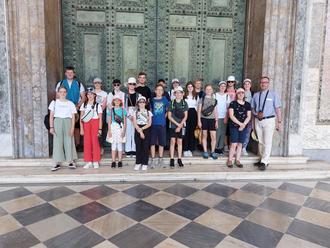 Nachdem die Fahrt aufgrund der Corona-Pandemie leider mehrmals verschoben werden musste, war es in der ersten Woche der Sommerferien nun endlich soweit. Insgesamt 20 Kinder und Jugendliche aus den Kirchengemeinden Schleid, Motzlar, Kranlucken, Ketten, Spahl und Geismar konnten am Samstag, den 8. Juli 2023 gemeinsam mit Pastor Dr. Jürgen Kämpf zur Messdiener-Romwallfahrt nach Italien aufbrechen. Kaum am Flughafen in Rom gelandet, ging es mit mehreren Shuttlebussen zur Unterkunft und somit auch schon zur ersten Besonderheit der gesamten Reise, da das Hotel unmittelbar an der Basilika Santa Croce in Gerusalemme gelegen war. Die Basilika Santa Croce, welche wir noch am selben Tag besichtigen konnten, ist heute Aufbewahrungsort vieler verschiedener Reliquien aus dem Umfeld der Kreuzigung Jesu, mitunter kleinster Teile des Kreuzes Jesu selbst.