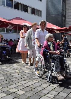 Im Anschluss folgten die Bewohner gerne dem Aufruf einer Rollstuhlpolonaise. Es wurde gesungen, geschunkelt und geklatscht. Der eine oder andere Bewohner sagte auch zu einem Tänzchen mit den Mitarbeitern nicht „Nein“.