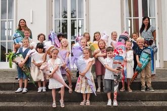Die Schulanfänger der Grundschule Geisa mit ihrer Klassenlehrerin Frau Konschak (hinten rechts) und Hortnerin Frau Teuber (hinten links)