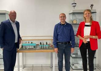 Thomas Kemmerich (links) mit Bürgermeisterin Manuela Henkel (rechts) mit Konstantin Drakopoulos (Mitte) von der Firma Pfarr Stanztechnik in Buttlar