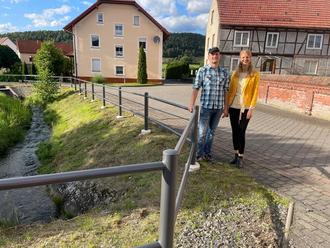 (v.l.n.r.) Bürgermeisterin Manuela Henkel und Ortsteilbürgermeister Danilo Schlapmann am neuen Geländer an der „Geisa“