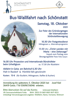 Herzliche Einladung zur Bus-Wallfahrt nach Schönstatt am Samstag, dem 18.10.2025. Abfahrt ist um 6 Uhr am Bahnhof in Geisa mit einem Bus. Beginn ist um 10.30 Uhr mit dem Festgottesdienst, anschl. Mittagessen und Alternativprogramm. Den Abschluss bildet um 16 Uhr die Prozession und internationale Bündnisfeier beim Uhrheiligtum. Die Rückfahrt ist für ca. 17.30 Uhr geplant. Die Kosten für Busfahrt, Mittagessen, Kaffee und Kuchen belaufen sich auf 70 €.