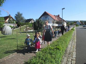 Die Mädchen kamen in tollen Trachtenkleidern in den Kindergarten und auch die Jungen hatten einen Kirmeshut mitgebracht. Schon am frühen Morgen stimmten sich die Kinder mit Kirmesliedern und dem Kirmesspruch auf den schönen Tag ein. Um 10 Uhr wurden die „Rhönzwerge“ von den Kirmesmädels aus Kranlucken im Kindergarten abgeholt und gemeinsam zogen alle mit Liedern und Gesang und toller Partymusik zur Kirmeslinde in Schleid. Auch die Kirmesmädchen hatten sich herausgeputzt mit“ Dirndeln“ und Blumen im Haar. Sie erfreuten alle Kinder mit ihrem Kirmesspruch, „Die Kroalicker Kirmes, sie lebe hoch…“.