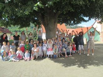 Um die Linde herum fassten sich alle an den Händen und tanzten den „Rucki Zucki“. Alle „Rhönzwerge“ sowie auch die Erzieherinnen hatten viel Freude dabei. Jedes Kind bekam von den Kirmesmädchen natürlich auch ein „Kirmesgetränk“ eingeschenkt und es wurde auf die Kirmes kräftig angestoßen. Einige Eltern der Kinder kamen als Zuschauer hinzu, welche sich an dem lustigen Treiben erfreuten.