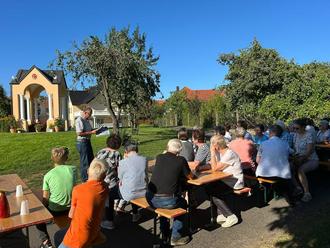 Gerhard Leister berichtet den Gästen über den Bau der Fátima-Kapelle auf dem Unterrothof