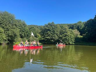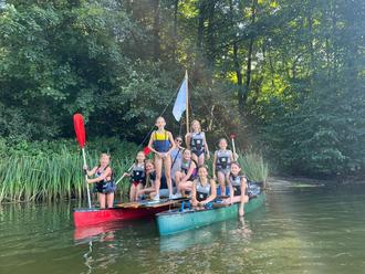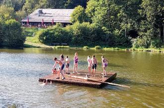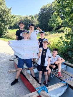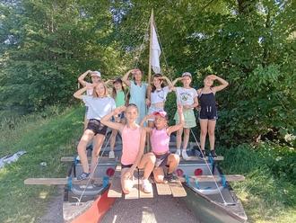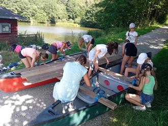Dort angekommen, erfolgte die Gruppeneinteilung und die Einweisung. Schnell hatten sich zwei Gruppen gebildet. Die Jugen traten gegen die Mädchen an. Aus den bereitgestellten Materialien wurden die Flöße verbunden und verbaut. Die mit Schwimmwesten ausgerüsteten Mannschaften konnten nun ihre Flöße ins Wasser lassen. Eine Riesengaudi, zwei Flöße im Wettkampf um den Schnellsten auf dem Wasser. Und immer wieder unüberhörbare Schlachtrufe. „Männer, auf!“ und „Eins, zwei, drei, vier, dieses Spiel gewinnen wir. Fünf, sechs, sieben acht, die Jungs die werden platt gemacht. Neun, zehn, elf und zwölf, nur die coolen girls!“