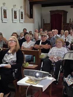 Vollbesetzte St. Ursula Kirche mit historischem Bildervortrag zur Jahrfeier in Wiesenfeld