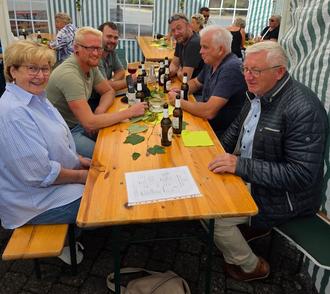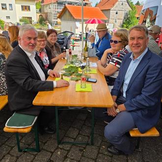 Pfarrer Martin Lerg (links) und Ortsteilbürgermeister Michael Kehl (rechts) in geselliger Runde mit den Wiesenfeldern