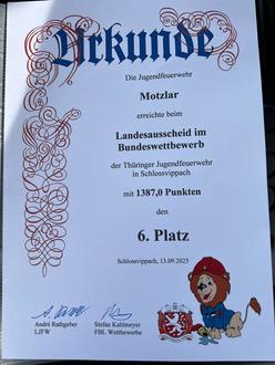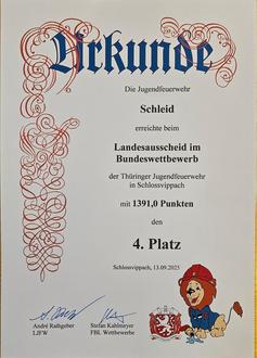 Mit 1391 Punkten erreichte die Jugendfeuerwehr Schleid/Kranlucken einen hervorragenden 4. Platz, dicht gefolgt von der Jugendfeuerwehr Motzlar, die mit 1387 Punkten den 6. Platz belegte. Damit gehören beide Ortsteiljugendfeuerwehren zu den besten Mannschaften Thüringens.
