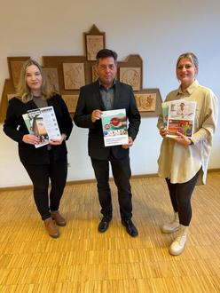 Gemeinsam präsentieren Andreas Schwanz, Schulleiter des Staatlichen Berufsbildungszentrums und der Medizinischen Fachschule Bad Salzungen, Sarah Falk (li.) und Maria Nick (re.), vom Amt für Kreisplanung und Regionalentwicklung, Wirtschaftsförderung im Landratsamt Wartburgkreis, die neue Broschüre