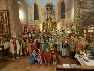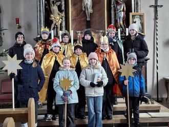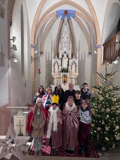 Die Sternsinger aus Wiesenfeld mit Pfr. Martin Lerg in der Kirche St. Ursula