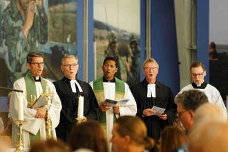 An seiner Seite hatte Ernst als Konzelebranten Dechant Markus Blümel und Pater Binesh Mangalan aus Eiterfeld, Pfarrer Roland Jourdan aus Vacha sowie den Theologie-Studenten Marcel Krawietz. Für die Lesung war die Point-Alpha-Mitarbeiterin Katrin Werth zuständig. Für die musikalische Umrahmung sorgten die Stadtkapelle Geisa unter der Leitung von Stephan Nimmich sowie Sänger und Keyboarder Ariel Arnhold, der das Publikum in der vollbesetzten Halle des US Camp zum Mitsingen und Mitschnipsen zu lateinamerikanischen Rhythmen animierte.