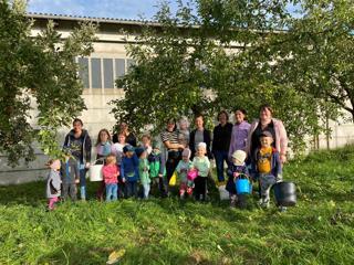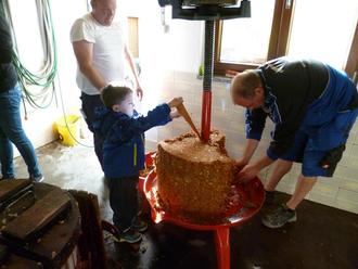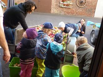 Am Wochenende vorher sammelten bereits viele fleißige Kinder und Eltern in Ketten über 14 Säcke Äpfel. Diese, und noch andere gesammelten Äpfel der Kindergartenkinder, wurden nach Geismar zur Familie Veltum transportiert. Nach einer gründlichen Wäsche konnten die Kinder ihre Muskeln spielen lassen und versuchten, die Äpfel in der Apfelpresse zu zerkleinern. Mit Unterstützung von Andreas Veltum und einigen helfenden Vätern konnten die Kinder sehen wie der leckere Saft im Behälter der Saftpresse zusammenlief. Schon seit vielen Jahren unterstützt die Familie Veltum den Kindergarten in dieser Weise. Die Kinder erleben aus erster Hand, wie aus ihren gesammelten Äpfeln der leckere Apfelsaft gewonnen wird. Bei allen Arbeitsschritten durften sich die Kinder persönlich betätigen und mithelfen. Natürlich wurde der Saft noch vor Ort verkostet!