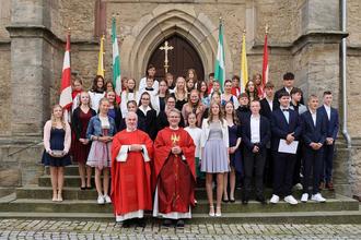Geisa. Am Sonntag, den 15. September, spendete Domkapitular Prof. Dr. Cornelius Roth in der Stadtpfarrkirche Geisa 25 Jugendlichen aus Geisa, Bremen, Otzbach und Geblar das Sakrament der Firmung. Seit Mai diesen Jahres haben sich die Jugendlichen zusammen mit Pfarrer Lerg auf die Firmung vorbereitet. Nach einer feierlichen Begrüßung des Firmspenders durch Pfarrer Martin Lerg und der Stadtkapelle Geisa begann das Festhochamt. An diesem Sonntag stand das Christus-Bekenntnis des Petrus im Mittelpunkt des Evangeliums. Dr. Roth ermutigte in seiner Predigt die Firmbewerber zu diesem Bekenntnis. In der heutigen Zeit ist das alles andere als selbstverständlich. Gerade dazu braucht es den Beistand des Heiligen Geistes. In der Firmung, das bedeutet zu deutsch Stärkung, werden sie mit dem Geschenk des Heiligen Geistes besiegelt. Von jetzt an beginnt ihr Leben als mündige und verantwortliche Christen.