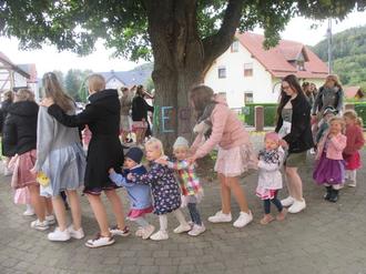 Um die Linde herum fassten sich alle an den Händen und tanzten den „Rucki Zucki“. Alle „Rhönzwerge“, sowie auch die Erzieherinnen hatten viel Freude dabei. Jedes Kind bekam von den Kirmesmädchen natürlich auch ein „Kirmesgetränk“ eingeschenkt und es wurde auf die Kirmes kräftig angestoßen. Einige Eltern der Kinder kamen als Zuschauer hinzu, welche sich an dem lustigen Treiben erfreuten.