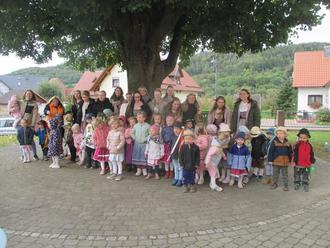 Die Kirmesgesellschaft aus Motzlar zu Besuch bei den Kita-Kindern aus Schleid