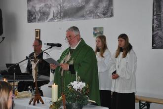 Um 10 Uhr begann der Gottesdienst in der Fahrzeughalle der Feuerwehr. Stadtpfarrer Martin Lerg eröffnete die Heilige Messe mit Unterstützung der Messdienerinnen Lene Nimmich, Magdalene Henkel, Alisia Ebert und Messdiener Arno Henkel. Als langjähriger Küster fungierte Josef Kiel. Die Fahrzeughalle war mit Gottesdienstbesuchern voll besetzt und die Gläubigen nahmen mit Aufmerksamkeit an der Heiligen Messe teil. Die musikalische Umrahmung übernahm Ullrich Göb. Josef Kiel trug die „Lesung“ vor.