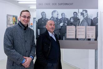 Rainer Eppelmann als Gast in der Ausstellung im Haus auf der Grenze und gleichzeitig sozusagen als Exponat: Eine Tafel in der Ausstellung zeigt ihn als Abrüstungs- und Verteidigungsminister der letzten DDR-Regierung, der die Auflösung der Nationalen Volksarmee unterzeichnete. Links Philipp Metzler, Vorstand und Studienleiter der Point Alpha Stiftung.