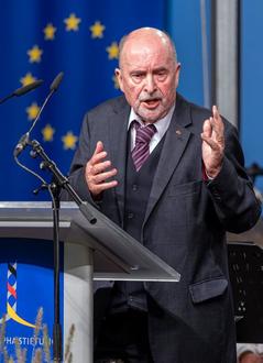 Diktatur oder Demokratie? Kein Unterschied? Der heute 82-jährige Berliner weiß wovon er spricht. Er hat nicht nur Geschichte erlebt, er hat sie geprägt. Eppelmann ist eines der bekanntesten Gesichter der Oppositionsbewegung in der DDR und des turbulenten Revolutionsherbstes. Als Minister für Verteidigung und Abrüstung in der letzten und einzig frei gewählten DDR-Regierung löste er die Nationale Volksarmee (NVA) auf. Dem aufmerksamen Publikum lieferte Eppelmann einen detaillierten Einblick in das damalige Leben in der DDR, „wo einer herrschte, er die Macht hatte, er bestimmte für alle Bürger, denn er alleine weiß, was für jeden richtig ist“. Bei diesem Diskurs mit der Geschichte analysierte aus seinem Blickwinkel zudem markante politische Ereignisse wie den Mauerbau, den Arbeiteraufstand 1953 oder die erste Massendemonstration in Leipzig am 9. Oktober 1989, „der Tag, an dem die Angst die Seite wechselte“.