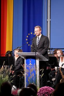 Katja Wolf sprach sich dafür aus, dass vor allem die Sozialisation für Ostdeutschland eine größere Rolle spielen solle. „Die Menschen dort müssen besser mitgenommen werden“, forderte die stellvertretende Ministerpräsidentin und Finanzministerin von Thüringen. Trotz des feierlichen Anlasses sei für sie die Grenze zwischen Ost und West in gewissen Lebensbereichen weiterhin spürbar und führte dazu kulturelle Aspekte als Beispiel an. Ihr Wunsch sei es, dass wir uns als gemeinsame Deutsche empfinden, mit gegenseitigem Respekt und dass man sich gegenseitig zuhören. Mit dem Blick zurück auf die Wiedervereinigung unterstrich auch sie den Beitrag der Bürgerbewegung, erinnerte aber unter anderem auch an Länder wie Ungarn oder Politiker wie Willy Brandt, George W. Bush und Michail Gorbatschow, die den Weg für die Deutsche Einheit ebenfalls bereitet hätten.