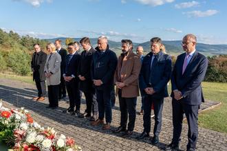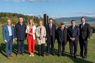 Festakt zum 35. Tag der Deutschen Einheit mit dem Denkmal auf Point Alpha im Hintergrund (von links): Jürgen Hahn (Bürgermeister Point-Alpha-Gemeinde Rasdorf), Bernd Woide (Landrat Landkreis Fulda), Manuela Henkel (Bürgermeisterin Point-Alpha-Stadt Geisa), Katja Wolf (Finanzministerin u. stellvertretende Ministerpräsidentin Thüringen), Dr. Stefan Heck (Stiftungsratsvorsitzender Point Alpha Stiftung), Boris Rhein (Ministerpräsident Hessen) und Benedikt Stock (Geschäftsführender Vorstand Point Alpha Stiftung).
