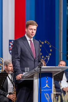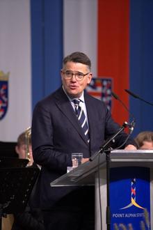 „35 Jahre Deutsche Einheit und 30 Jahre Point Alpha erinnern uns daran: Freiheit ist nicht selbstverständlich. Sie muss errungen und verteidigt werden“ betonte Boris Rhein in seinem Grußwort. „Gleichgültigkeit ist die größte Bedrohung für das, was wir genießen“, mahnte der hessische Ministerpräsident. Vielmehr brauche die Gesellschaft Haltung, Verantwortung, den Einsatz auch für die Schwächeren und man dürfe nie schweigen. „Unsere offene Art zu Leben ist unter Druck geraten. Wir wollen ein Bollwerk für Vielfalt und Werte und müssen uns auf unsere Stärken besinnen“, führte der Landeschef weiter aus. Der eins heißeste Punkt im Kalten Krieg habe eine besondere Aura und stehe für die Einheit und unsere Partner und Freunde, die uns auf dem Weg zur Wiedervereinigung unterstützt hätten. „Jahrzehntelang standen hier amerikanische Soldaten Seite an Seite mit den Menschen in der Region.“ Seinen Dank richtete er an die Point Alpha Stiftung. Sie mache Geschichte sichtbar und bewahrt die Erinnerung. Europa müsse Friedens- und Freiheitsprojekt bleiben.