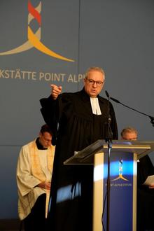 Zuvor hatte Pastor Dr. Jürgen Kämpf aus dem Dekanat Hünfeld-Geisa die rund 500 Gläubigen begrüßt. Dabei verwies auf eine Spaltung in der Gesellschaft mit Zerrissenheit, Gewalt, Krieg und Ungerechtigkeit. Die Menschen hätten das Gefühl sich in einer Orientierungslosigkeit zu verlieren. Für ihn sei daher der Blick zu Gott so wichtig im Vertrauen darauf, dass dieser Orientierung und Versöhnung schenke.