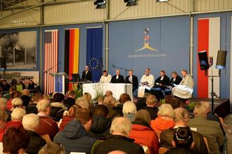 Eingangs hatte Benedikt Stock die rund 500 Besucher in der vollbesetzten Fahrzeughalle begrüßt, darunter Geisas Bürgermeisterin Manuela Henkel, Rasdorfs Bürgermeister Jürgen Hahn, die hessische Landtagsabgeordnete Stefanie Klee, sowie der erste Vorsitzende des Fördervereins Point Alpha Raymond Walk. Der Geschäftsführende Vorstand der Point Alpha Stiftung stellte noch einmal die Bedeutung der Deutschen Einheit heraus und zollte den Mitwirkenden und den vielen Helfer seinen Dank für deren Unterstützung. Der Erlös aus der Kollekte ist für die Organisation „Kirche in Not“ bestimmt.