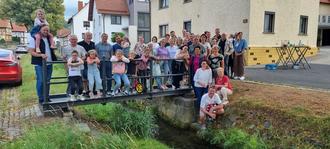 Borsch. Am Tag der Deutschen Einheit wurde die neue Brücke in Borsch über dem Dorfbach von Ortsteilbürgermeister Hubert Wilhelm gemeinsam mit den Anliegern eingeweiht. Der Ortsteilbürgermeister begrüßte alle anwesenden Brückenanlieger und Gäste und berichtet über den Bau und Abriss der alten Holzbrücke. Die alte Holzbrücke wurde in der ersten Dorferneuerung mit der Sanierung des Dorfbaches im Jahr 1996 erbaut. In den letzten Jahrzehnten musste der Bauhof immer wieder an der Brücke Belag und tragende Teile austauschen um die Brücke für den Fußgängerverkehr zu erhalten. Aber in diesem Jahr war der Zerfall des Holzes schon so weit fortgeschritten, dass eine Reparatur der Brücke nicht mehr wirtschaftlich gewesen wäre. Deshalb wurde die Brücke im Sommer 2023 aus Sicherheitsgründen entfernt. Für die neue Brücke mussten als Auflage zwei Streifenfundamente vom Bauhof der Stadt Geisa hergestellt werden. Der Mitarbeiter vom Bauhof der Stadt Geisa Egbert Eisele baute die Brücke aus Stahl in der Werkstatt am Bauhof zusammen, lies sie verzinken und pulverbeschichten, so dass die Brücke farblich und optisch dem Geländer am Dorfbach angepasst wurde. Die Brücke wurde in zwei Teilen, d. h. Brückenkörper und Geländer, vormontiert und mit einem Kran auf den Fundamenten aufgesetzt und befestigt. Mit der neuen Brücke wurde gegenüber der alten Brücke ein nachhaltiges Bauwerk errichtet, was alle Anwohner sehr gefreut hat. Ortsteilbürgermeister Wilhelm bedankte sich bei der Stadt Geisa, beim Bauhof und ganz besonders bei Egbert Eisele für die fachgerechte Ausführung des Bauwerks.
